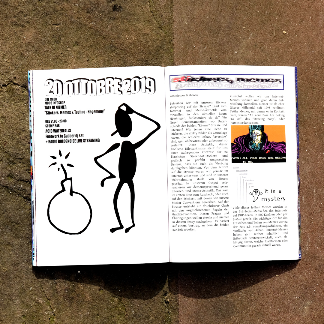 Our second zine contains interviews with sticker artists, photos, features on sticker trading & scratching and an essay about the intersections of internet memes and sticker culture.