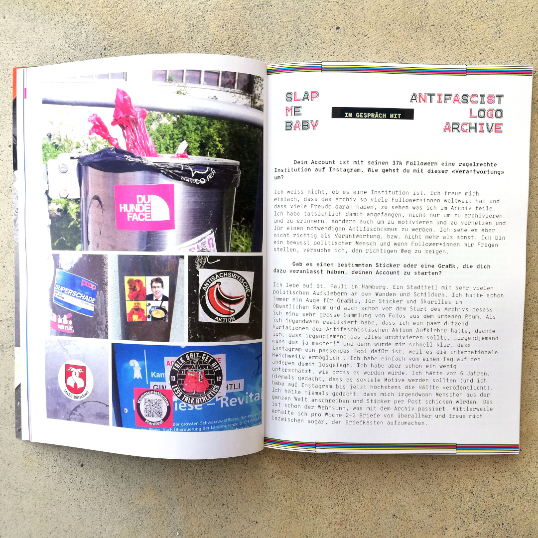 Das neue Zine ist da! Mit über 200 Bildern dokumentieren wir im fünften Zine das Stickergeschehen in Basel, Bern und Barcelona. Die aktuelle Ausgabe ist dem Sammeln und Archivieren gewidmet. Wir konnten @antifascistlogoarchive aus Hamburg interviewen, einem subkulturellen Archiv einen Besuch abstatten und Stickerkitty aus den USA für einen Beitrag gewinnen. Weiter gibts akademische Feldforschung auf Clubtoiletten und allerlei erheiternde Betrachtungen zum Stickergame.